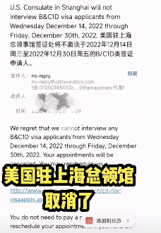 美领馆上海签证处的预约时间已经排到了明年4月份,这是我们在前几天报道的,上海签证处也在上周末紧急发文通知取消从周一(12月12日)至12月31日的B类所有签证预约: