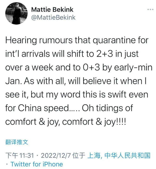 《经济学人》杂志中国分部的一名负责人也在社交媒体上发文提到这个政策的变化,她说她从多个渠道获悉中国将从一周后开始实施2+3的入境隔离政策,1月开始实施0+3的政策,彻底取消酒店隔离。