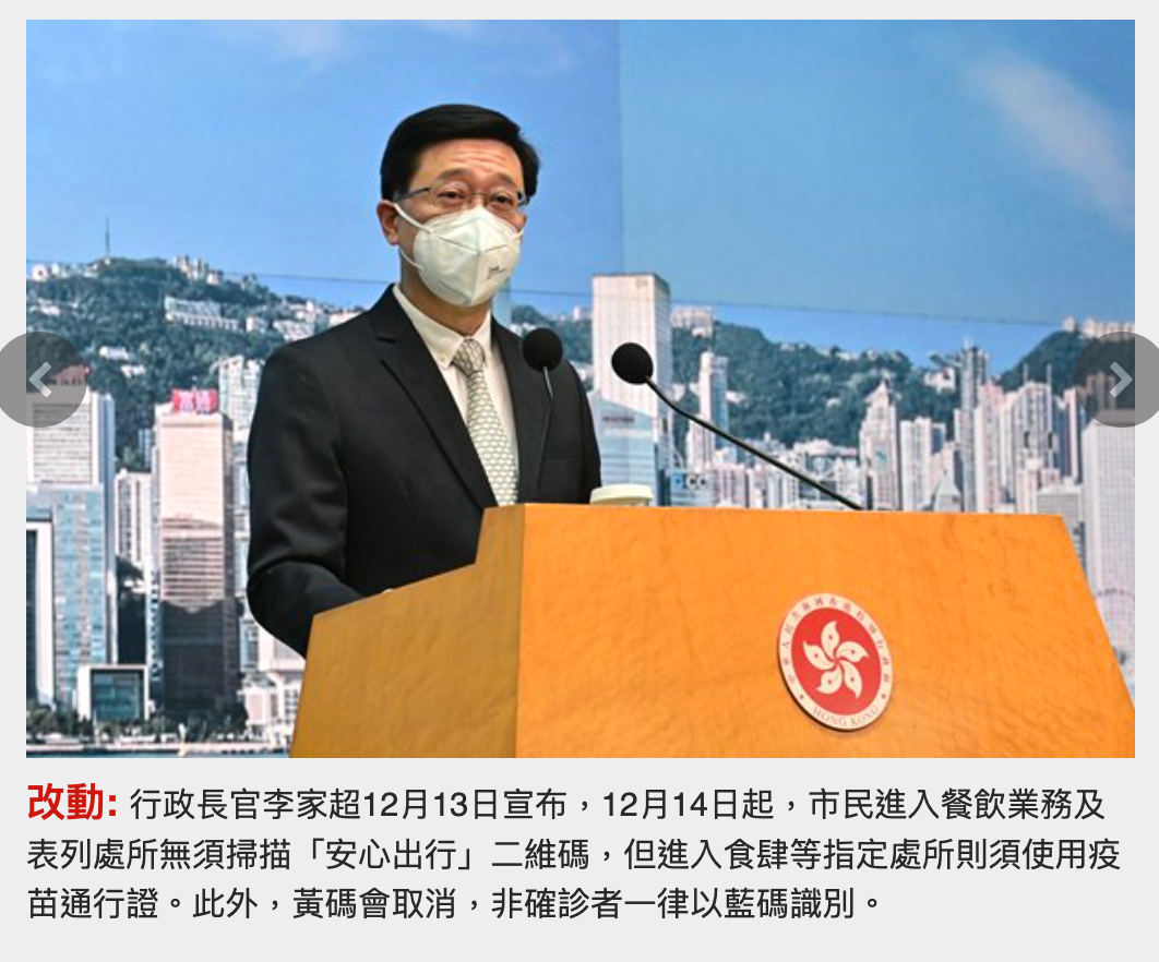 李家超说,星期三起,香港市民无须再使用“安心出行”app,但会保留食肆等指定处所的“疫苗通行证”安排,另外会取消“黄码”安排,