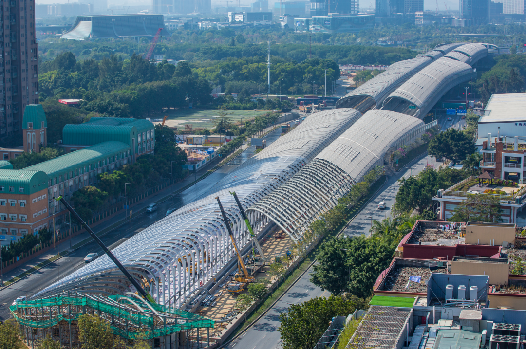 采用拱形骨架,寓意“腾飞的双翼”,与前海月亮湾跨线桥连成有机整体。