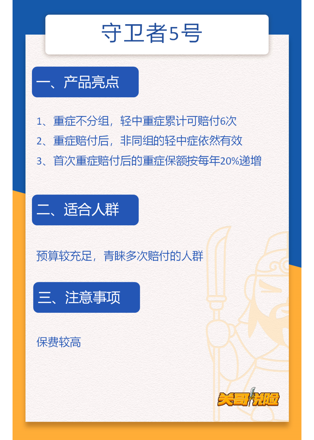 它比较特殊的地方在于,市面上大部分产品赔付过重症后,轻中症就无效了。但守卫者5号在被保人发生重症后,非同组的轻中症还继续有效。轻中重症共享6次赔付机会。