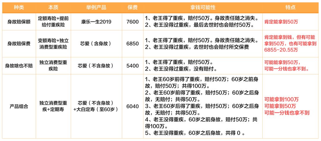 目前的重疾产品,按照身故责任的不同,主要有三种,同时加上比较常见的重疾+定期寿的组合,列个表格看看。