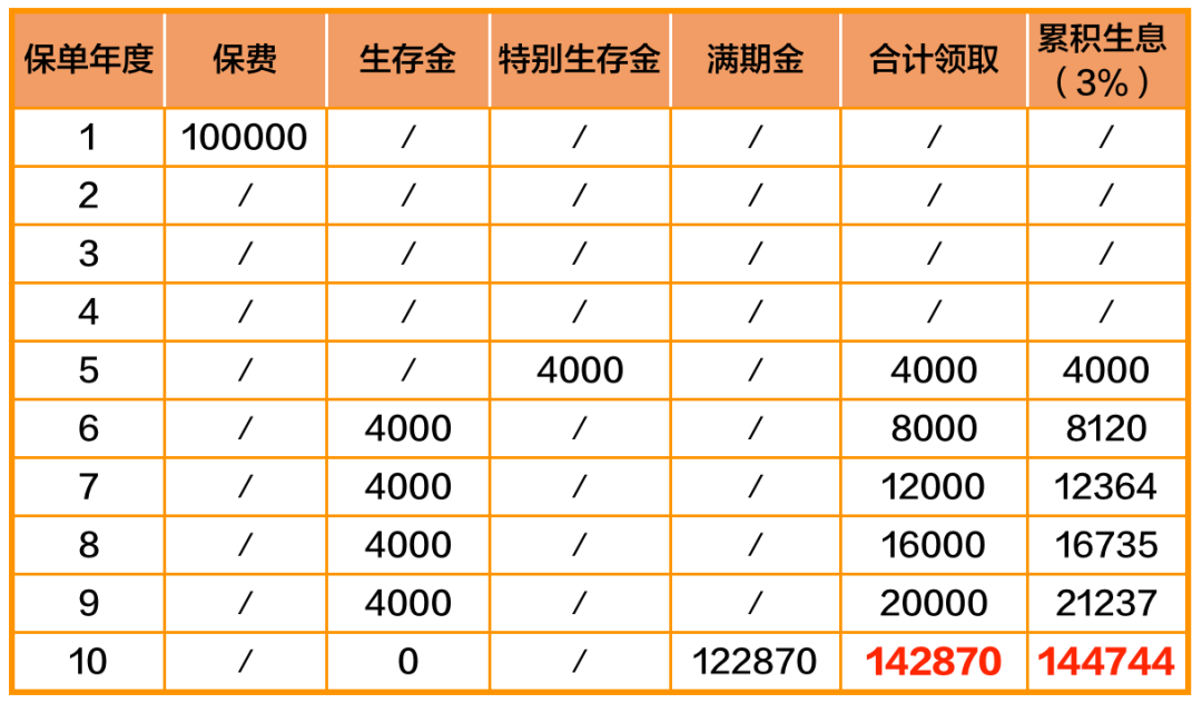 一位35岁的老母亲,女儿今年8岁,10年后刚好是上大学的年纪。她用自己的名义买了一份这样的「福佑金生」:也就是说,交了10万,10年后一共拿回来142870,这还是在领出来的钱没有利息的前提下。如果生存金不取走,放在保单里累积生息,按3%的累积生息利息算,那么到保单结束,一共领取的金额是144744。很明显,中间的现金释放几乎没有意义。这10年,就是一个封闭期,把钱安安稳稳的、以一个在利率下行的时代还不错的利率,锁定住。到期一次性释放出来,爱咋花咋花。母爱这种感情,很容易一不小心就把自己感动了。