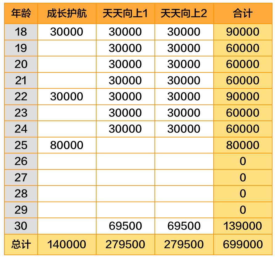 【成长护航】是很多年前的产品,早已停售,10850*8年,22岁领3万、25岁领3万,30岁领5万,外加大概3万+的分红,保单结束。【天天向上】5万*3年,18-24岁连续七年,每年领3万,30岁领69500的满期金。加在一起的效果呢,从18岁开始,娃在国内读个大学+研究生,够了。就算是考虑上通货膨胀支出上涨的影响,这些钱不敢说多宽裕,基本的学费和生活费,应该不是问题。30岁释放出的13.9万,如果在25岁之后有急用,提前退保,能拿到的金额,也能达到12万左右。关于买教育金的想法,关于产品的细节,都写过了,我不再赘言,大家感兴趣自己看就好。千万别跟我争论「买教育金不如买基金定投」这类问题,别问,问就是「你都对,是我傻」。知识点|我为什么给宝宝买「不划算的」教育金