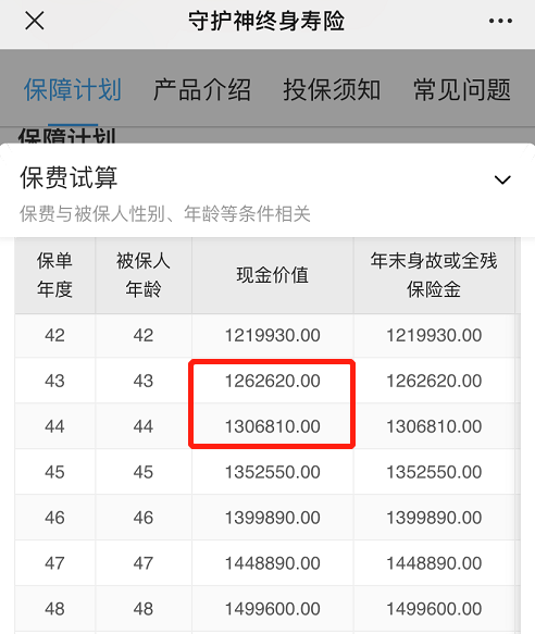 下面是守护神的现金价值表: