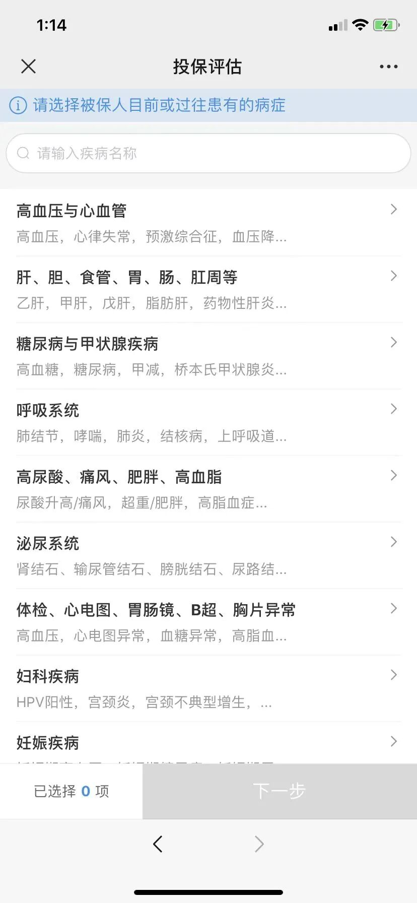 智能核保更像一种快捷获取核保结论的模板,我们可以自己在智能核保界面找到需要告知的疾病,然后根据上面的问题如实勾选。