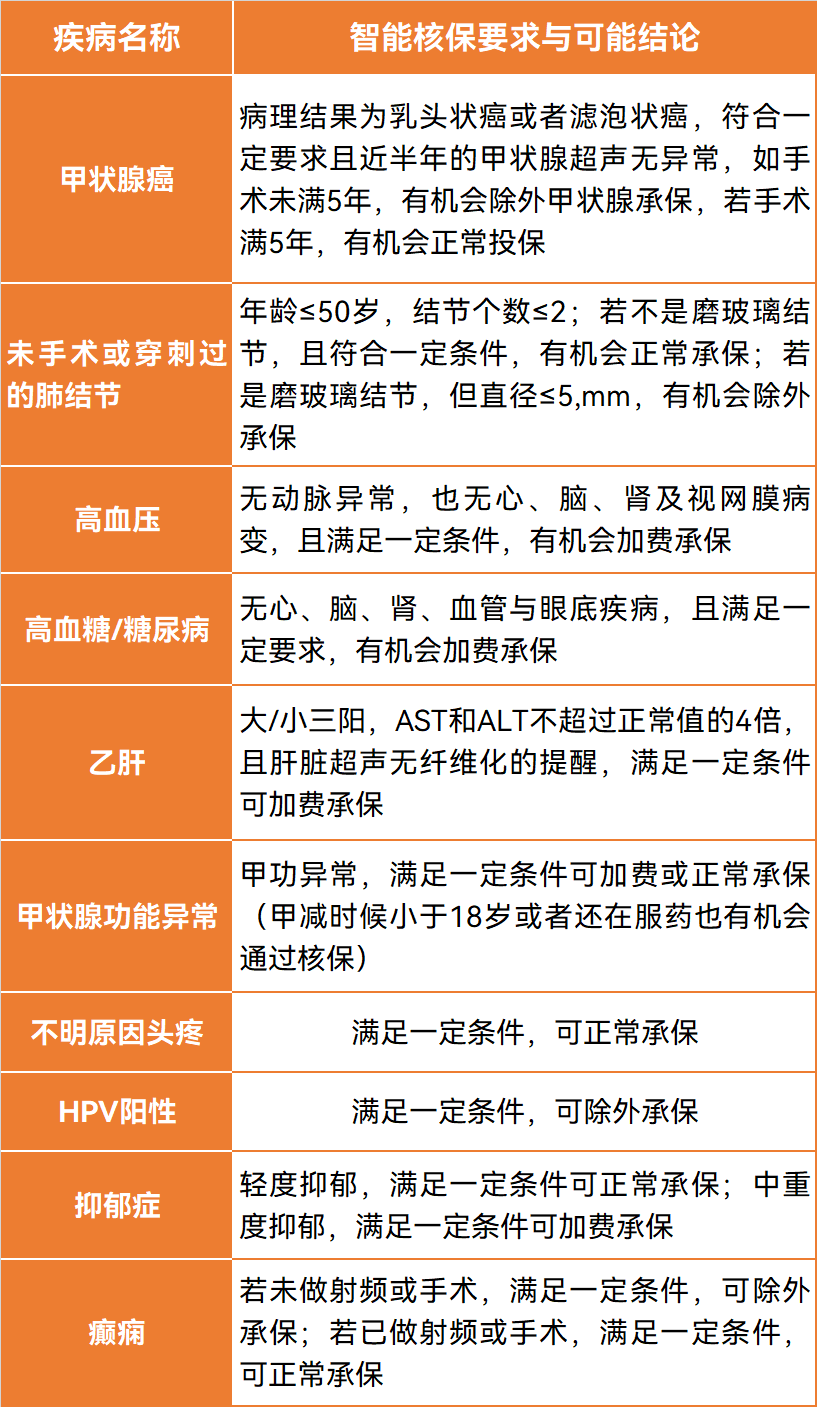 除了智能核保功能强大以外,它的核保尺度也是宽松的让人感叹。我罗列了一些常见拒保疾病在超越1号智能核保里面的要求与结论,你们自己品一品:
