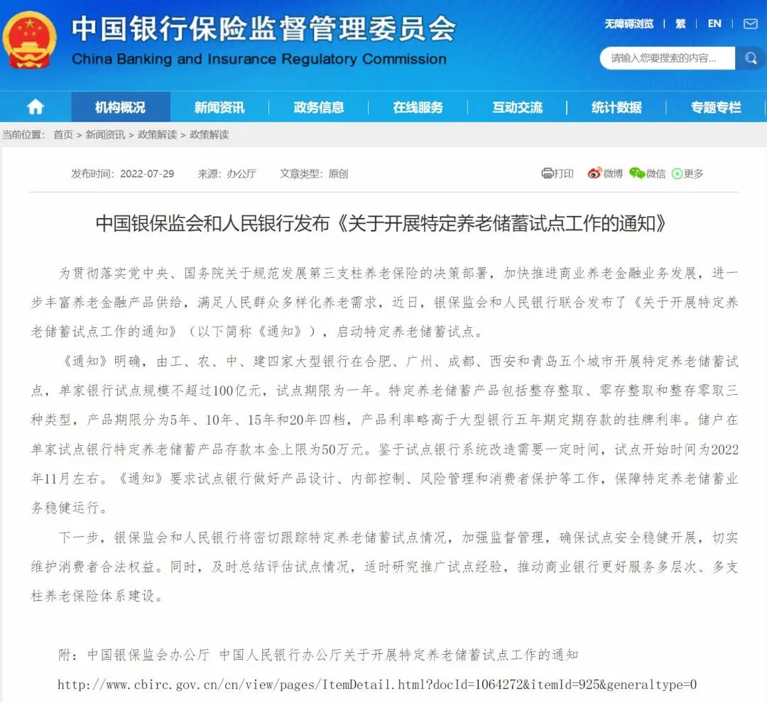 从上述通知中可以得知,从2022年11月20日起,工商银行、农业银行、中国银行和建设银行将在合肥、广州、成都、西安和青岛这五个城市开展特定养老储蓄试点。
