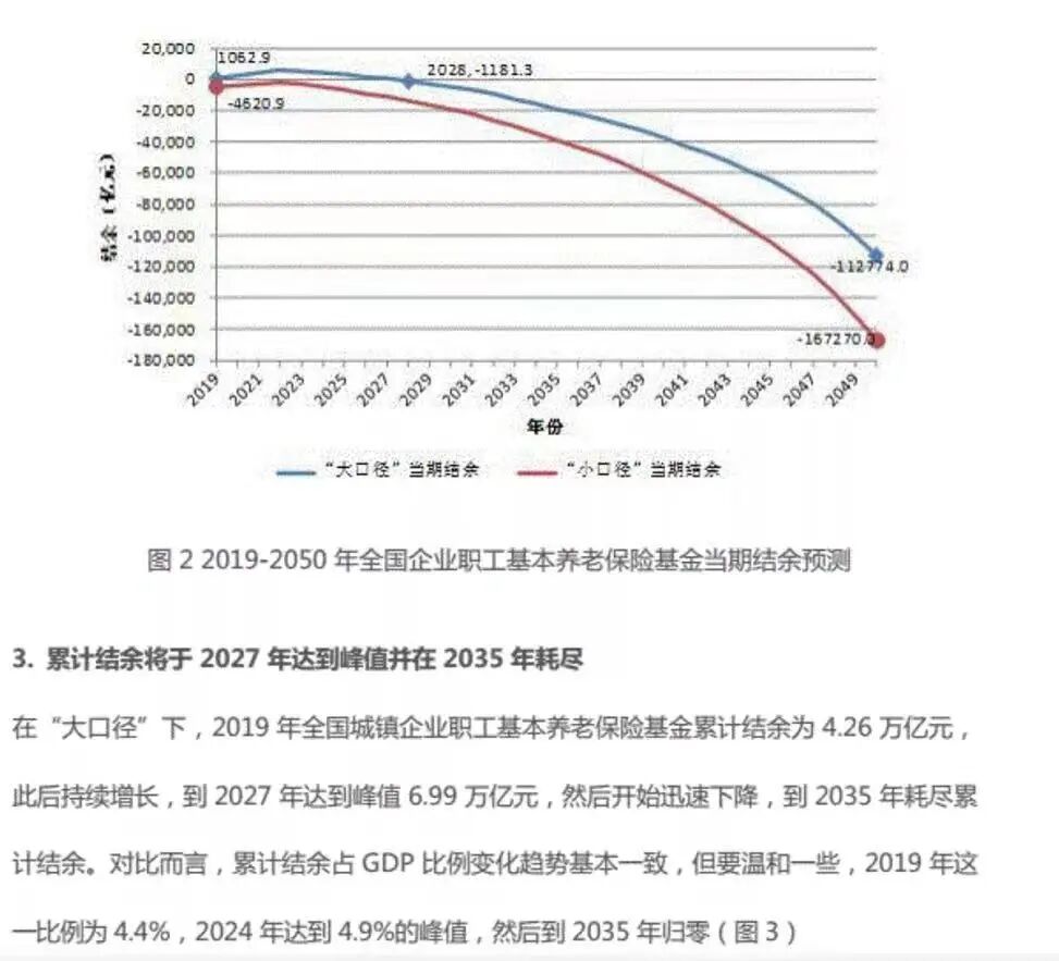 并且按照中国社科院的预测,我国城镇职工基本养老金的累计结余到2027年达到峰值7万亿后就会开始下降,2035可能耗尽所有结余。