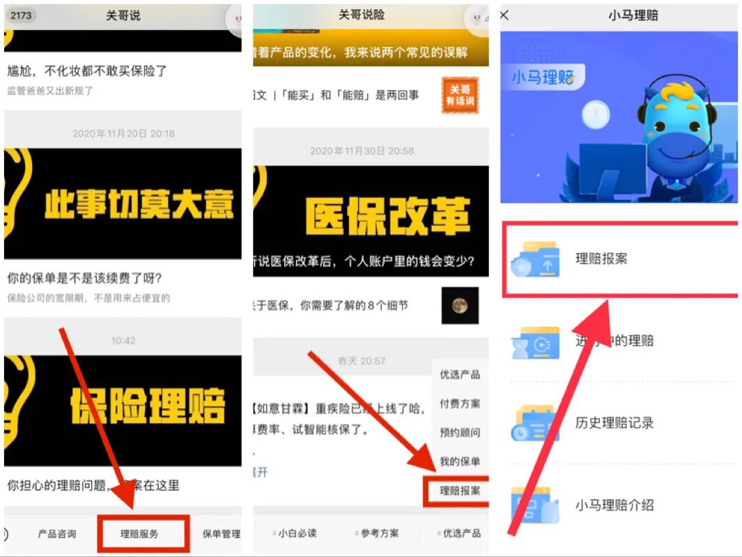 无论是「关哥说险」还是「关哥说」,都可以在底部菜单栏,找到「理赔服务」,直接点击进入报案。