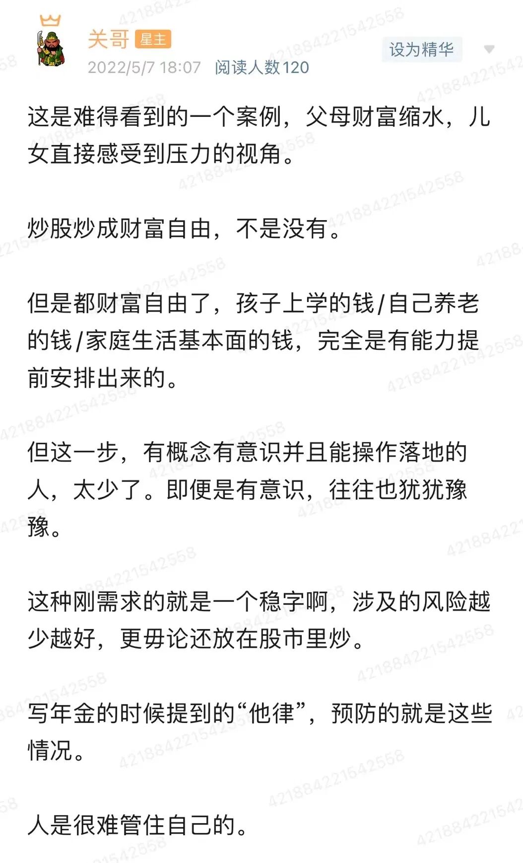 可能是职业病作祟,我每每听到「破产后家人生活有多惨多惨」这种话题,总是忍不住想,为啥没有分散风险,留足子弹呢,哪怕去私行做个财富规划也是好的呀。