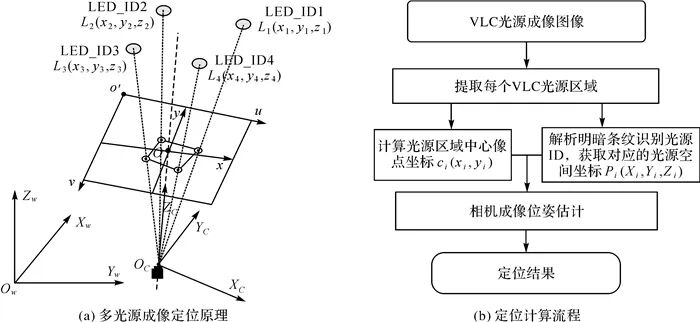 测量定位阶段根据摄影测量原理,利用相机内参数和VLP光源参考点坐标信息计算相机位姿实现定位。室内常用的LED光源主要分为小尺寸圆形灯和较大尺寸的矩形灯,布局方式多样。因此,根据VLP系统所用光源的形状、尺寸、数量及空间布局,分为单光源VLP方法和多光源VLP方法,同时根据VLP系统中所用的IS数量,分为单目VLP和双目VLP系统。基于单光源的VLP方法中,多数成像VLP系统的定位终端需要增加IMU姿态传感器辅助成像提高定位精度。基于多个光源成像的VLP系统如图 9(a)所示,一般使用4个以上尺寸较小的圆形光源,要求定位终端成像范围至少涵盖3个以上光源,满足空间后方交会成像位姿计算需要。定位终端相机对多个VLP光源成像后,定位计算流程如图 9(b)所示。首先,分别提取每个VLP光源区域图像,计算每个VLP光源图像的中心坐标,并解析明暗条纹信息,获取光源LED_ID及其对应的空间坐标;然后,根据成像几何关系计算相机位姿,得到定位结果,光源图像的中心像点一般取光斑轮廓几何中心或重心,LED_ID可以根据条纹图像解码或基于规则匹配的方法识别;最后,进行成像位姿计算,输出定位结果。 |