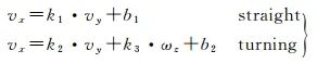 (9)具体模型构建中,本文选用多元回归与深度学习两种方法,实现观测域的NHC参数自主学习。由前述车辆非完整性约束分析可知,车辆侧向和垂向速度与车辆运动状态等因素密切相关,本文初步研究了两种车辆常规运动下的模型构建,即直线行驶和转弯行驶。此外,考虑到组合导航系统的水平误差相较于垂向误差发散得更快,这里重点考虑侧向速度约束。由于侧向速度与车辆前向行驶速度、转弯角速度呈现出较强的相关性,这里给出了两类回归模型。(1) 直线时仅利用前向速度拟合,转弯时利用前向速度和转弯角速度的线性叠加进行拟合
