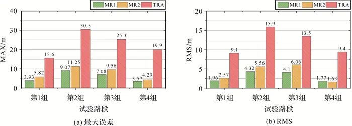 由于第一种多元回归模型的预测精度较高,水平误差发散较为缓慢,总体而言,两种模型都能有效抑制惯性误差发散,在200 s的时间内行驶里程为1.85 km,水平相对误差分别为2.1‰和3.1‰。可以看到,当车辆转弯的时候,由于侧向速度预测精度变差,相应的定位误差也变大,此外,不同处的转弯对侧向与前向误差的影响也不一致,这与载体机动带来可观测性变化有一定关联。4组试验路段的统计指标如图 9所示,相比于方差域调整参数的传统方法(TRA),在观测域进行多元回归的新模型具有显著的精度提升,由于第一种多元回归模型(MR1)考虑了更多变量因子,其约束效果普遍优于第二种模型(MR2)。此外,相比于传统模型,第一种多元回归模型的水平位置最大误差减小了70.2%~82.1%,水平位置误差RMS减小了69.6%~81.2%。 |