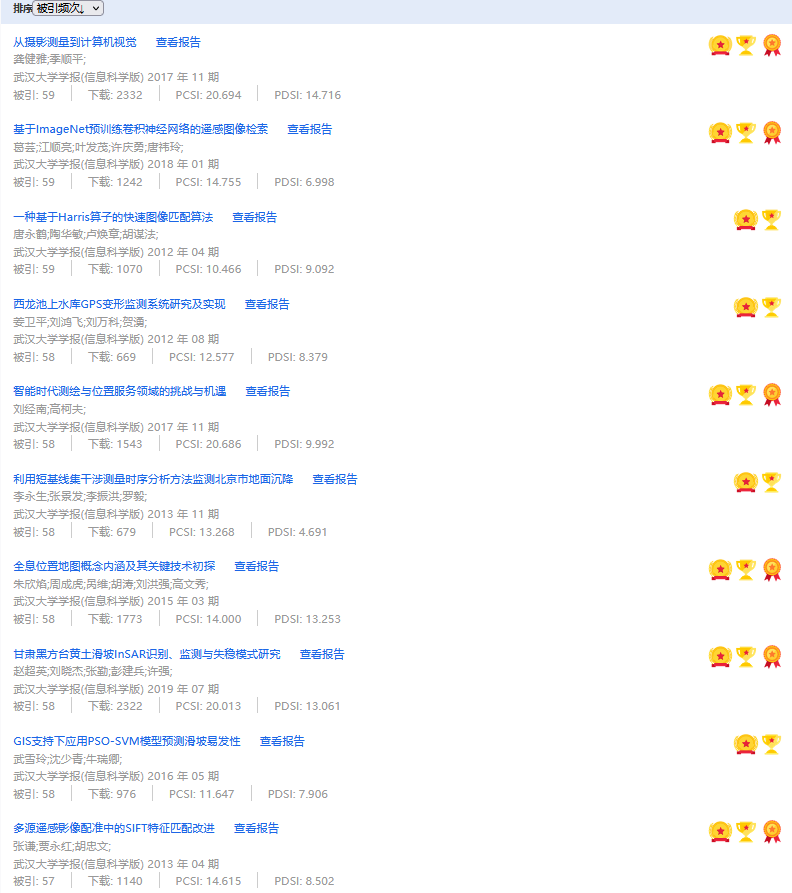 《武汉大学学报(信息科学版)》2011—2022年间共有1258篇论文入选《学术精要数据库》,其中205篇入选高被引论文、152篇入选高下载论文及212篇入选高PCSI论文,合计283篇三高论文(Top1%)。