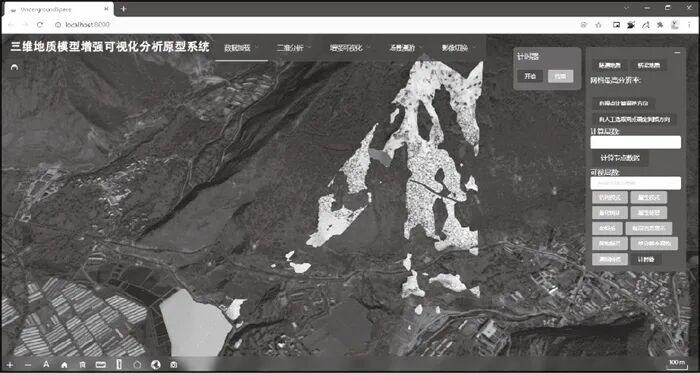 (2)(3) 根据均匀射线阵列在节点内部的交点属性与数量实现判识。若无交点,则将该节点记录为空节点;若有单个交点,则该交点处的属性值作为该节点判识结果并记录;若有多个交点,则将最先达到出现频次最多的属性值作为该节点判识结果并记录。以长方体为例,单个节点的一组4×4射线阵列扫描如图 5所示。当所有节点完成均匀射线阵列扫描判识后,绘制方式遵循以下规则进行。(2) 根据对节点是否为空的判断,按有无填充色区别空节点与非空节点:若为空节点,采用线框对其进行绘制,无填充色;若为非空节点,则以有填充色的立方体绘制。(3) 非空节点的属性特征通过立方体的颜色实现增强可视化表达。三维地质模型具有多种属性信息,如岩性、天然密度、风化程度等。为达到更直观的可视化效果,每次用户根据自己的需求只选取一种属性作为绘制的依据,采用不同的颜色绘制非空节点,以区分所有非空节点在该属性上属性值的差异。本文选择重大铁路某大桥与某隧道地质单元三维模型作为研究对象进行试验分析,基于WebGL技术搭建了三维地质模型增强可视化分析原型系统。客户端采用JavaScript、CesiumJS、Vue.js构建,服务器端采用Node.js v14.17.4构建,浏览器采用Chrome v96.0.4664.110。系统界面如图 6所示。为验证本文方法在分析效率、分析精度、可视化效果、用户交互体验的优势,在上述三维地质模型增强可视化分析原型系统的基础上,邀请20人参与试验。参与者年龄为20~30岁,均为GIS相关专业学生,并对地理信息系统、数字孪生平台等有较多的操作使用经验,可尽量减小年龄、知识背景、操作熟练度差异对结果的影响。参与者被随机均分为两组,使用本文增强可视化分析方法的小组被命名为试验组,使用三维网格类标尺可视化分析方法的被命名为对照组。两种方法对同一个三维地质模型场景的显示如图 7所示。参与者通过使用可视化交互方法,对本文所选取的地质要素空间几何特征(长度、宽度、厚度),以及地质要素与桥梁、隧道之间的空间关系特征(距离)进行量化分析,对选定区域的不同岩性的地质要素种类进行统计,并记录分析、统计结果。分析、统计总耗费时间通过参与者在开始和结束试验时用鼠标点击计时按钮由系统自动完成计时。参与者完成上述测试后,邀请所有测试者对本文增强可视化分析方法和三维网格类标尺进行体验,并对场景可视化效果、方法交互便捷程度提出直观感受,本文方法的可视化效果如图 8所示。通过参与者准确度评估参与者使用的可视化交互方法的精度,通过每组参与者完成整个测试的平均时间评估可视化分析方法的效率。根据试验组和对照组参与者的分析准确度和量化分析耗费时间,分别计算两组参与者的平均准确度和平均完成时间。根据试验结果可知,采用本文增强可视化分析方法的试验组平均准确率为93.72%,平均完成时间为85.35s;采用三维网格类标尺可视化分析方法的对照组平均准确率为82.48%,平均完成时间为120.76s。由此可知,本文增强可视化方法的分析精度较现行方法分析精度和效率分别提升13.63%、29.32%,说明本文方法在分析准确度的提升情况下,分析耗费时间也有较大提升。此外,在参与者均使用过两种方法对三维地质模型场景进行可视化分析后,大部分参与者认为在相同的分析精度下,采用本文方法的场景可视化效果更优,交互体验更为便捷。针对现有方法在三维地质模型空间几何特征、属性特征、与环境中其他要素之间的空间关系特征的感知和分析方面的不足,本文提出了一种基于视觉线索与变量组合的三维地质模型增强可视化分析方法,选取多种视觉变量和单目视觉线索并组合文字、符号,实现了对三维地质模型场景的增强可视化表达与定量分析;并搭建原型系统,选择重大铁路某大桥和某隧道两个区域地质单元开展案例试验分析。结果表明,本文方法较现有可视化交互分析方法,可视化分析效率与精度均有一定程度上的提升;在相同精度下,本文方法的可视化分析效果更优;用户的交互体验更优,不依赖特定视角,在大部分视角下均可有效感知和分析三维地质模型场景重要特征信息。此外,本文方法对以“透明地球”等为支撑技术的数字孪生建模具有重要意义。后续研究将采用沉浸式虚拟现实技术,以各类地下空间环境要素为研究对象,根据不同可视化应用场景下需求探索不同的增强可视化分析方法,为面向数字中国、智慧社会建设需求的数字孪生建模技术提供更完备的地上-地表-地下一体化表达技术支撑。