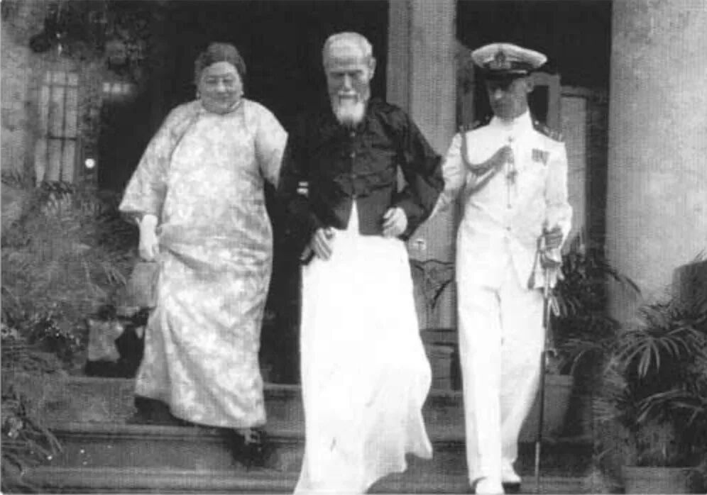 ▲一左一右就是何东的两个老婆(但并不是周绮文),中间白胡子老头是何东的老朋友萧伯纳。那时在港岛之外,何东被看作“与洛克菲勒一个量级的大亨”。他前往伦敦时,与首相丘吉尔会面,并获得英国维多利亚女王授勋。他的女儿是香港第一个从医学院毕业的女生,嫁给了林则徐的曾孙。