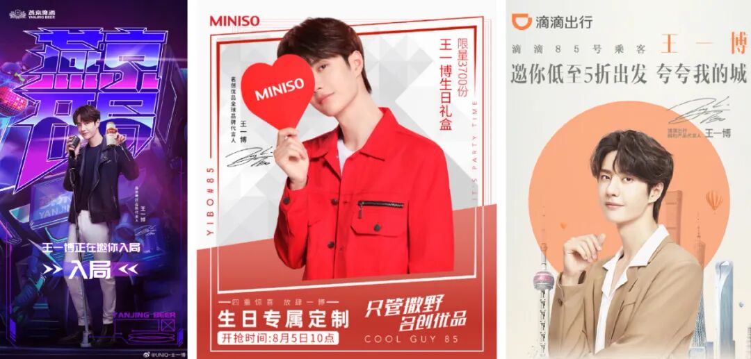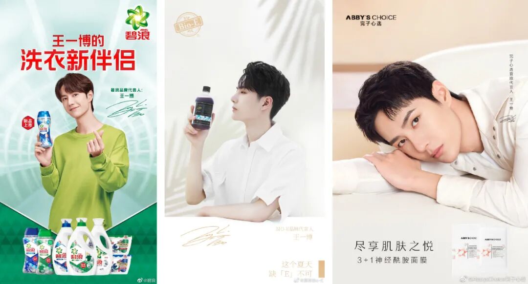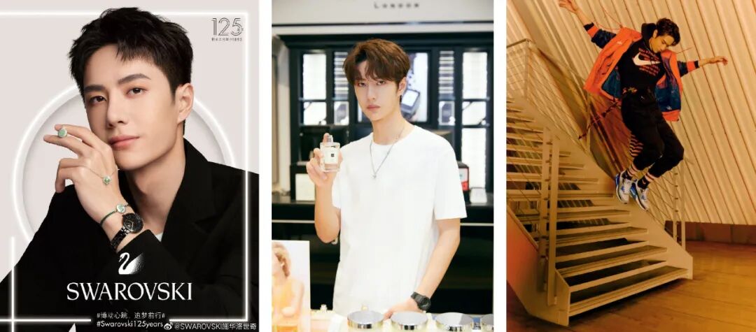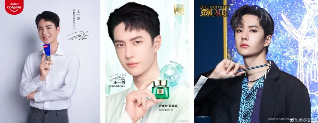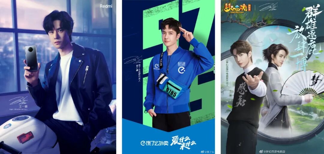 魅力之外,再加上他事业上的“全能”,演戏、跳舞、主持都可以。一部《陈情令》让他爆红,知名度打开,手里握着万千少女的心,这让他迅速具备了商家青睐的一切素质,所以他和前辈一样,成为了商家的宠儿,市场的宝贝。以前的男明星最常见的代言是快消品、机车、啤酒等,而现在王一博除了这些,还有大规模的美妆时尚、生活用品,哪个单拎出来都是响当当的一线品牌。我跟朋友戏言,一个人从睁开眼睛起床到晚上回家睡觉,这一天几乎都在和王一博的代言或合作品牌打交道。戴上施华洛世奇项链,喷点祖玛珑香水,穿上耐克鞋,美美哒准备出门啦:开着我的奥迪汽车,路过肯德基买份早餐,再加一瓶安慕希酸奶,社畜准备去公司上班;