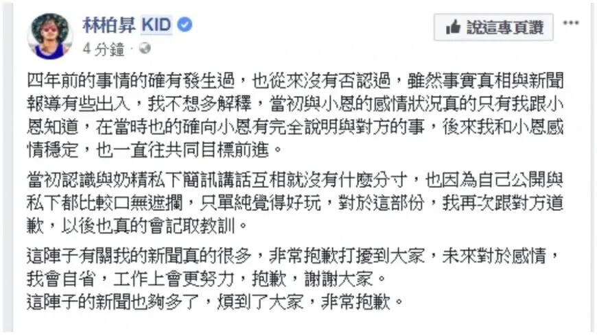 爆料一出,舆论哗然,操着“深情人设”却把别的女生带回自己女友家约炮。这种操作实在叫人大跌眼镜!之后Kid发文道歉,承认四年前的确有其事,但并没有多做解释:而许维恩也帮他说话,希望大众不要再纠缠过去之事不放: