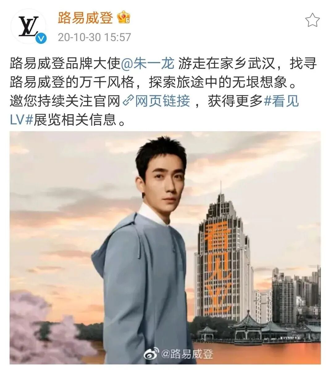 ▲2020年10月,LV选择将全球最大巡展“See LV”的首站放在武汉,可以看出对中国市场的重视程度,朱一龙恰好是武汉人。