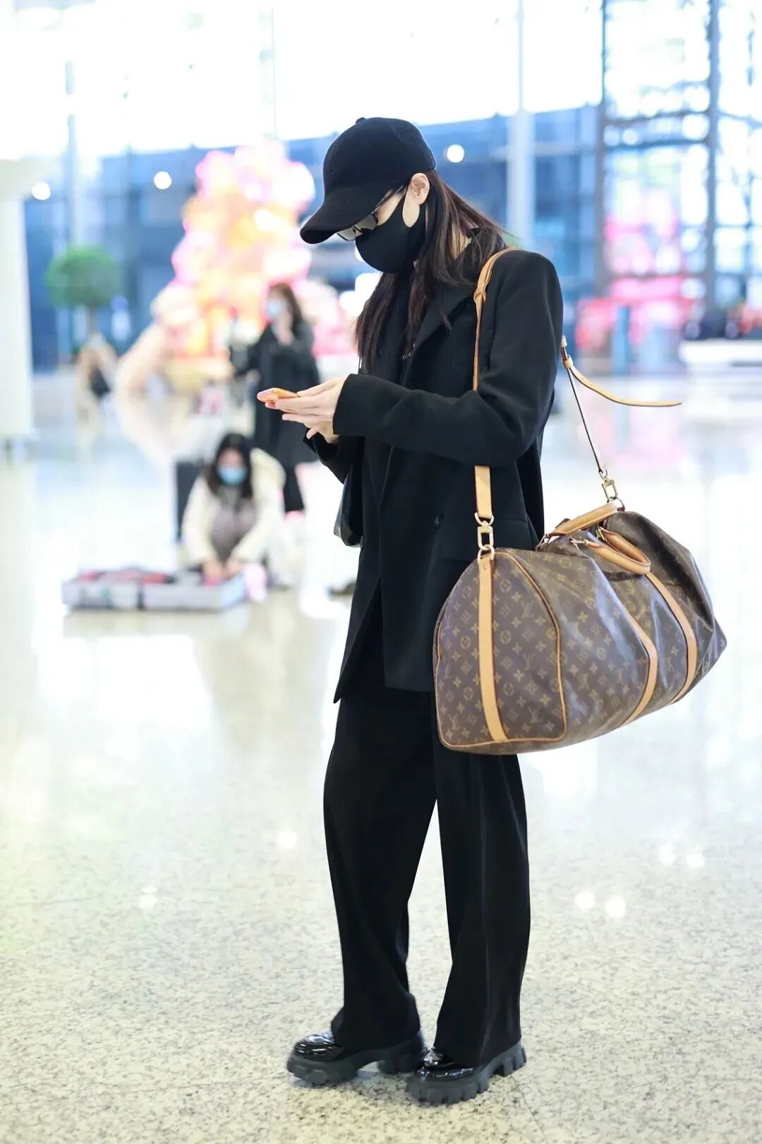 ▲背着路易威登著名的老花Speedy旅行袋出现在机场的钟楚曦,真是个尽责的品牌大使