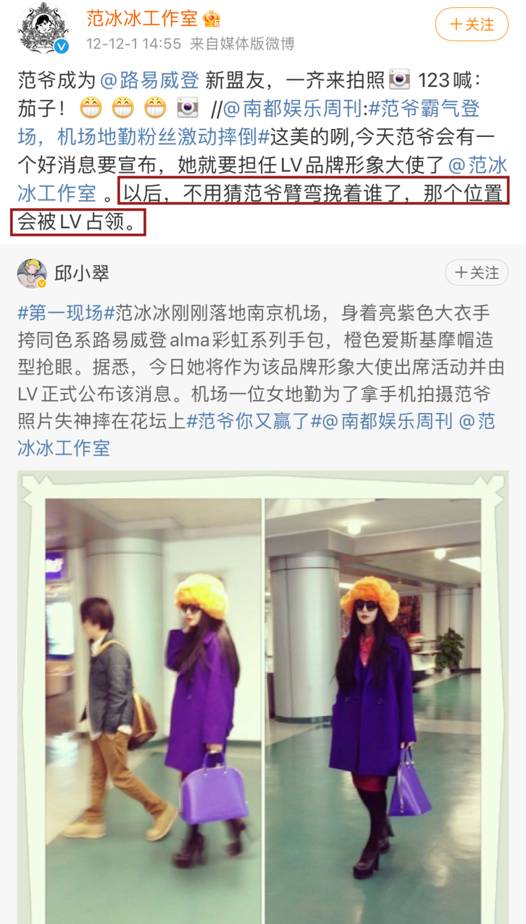 ▲图片来源:@路易威登微博、@范冰冰工作室