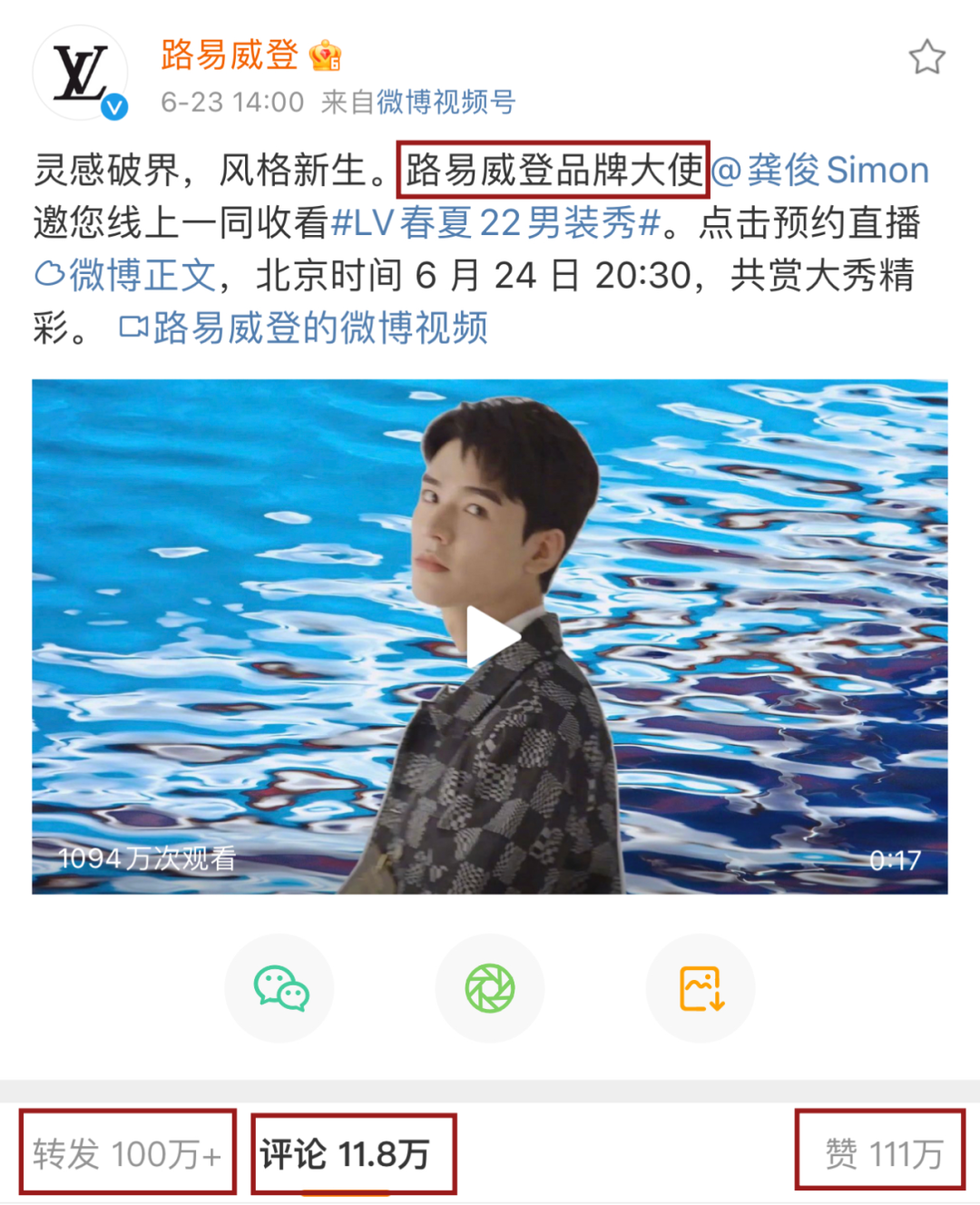 回看吴亦凡官宣代言LV的这条微博获得了,拥有100万+的转发量,造成了现象级的影响,而最近几条LV官微发布的吴亦凡相关微博,转发和点赞量也可以轻易突破50万甚至上百万大关。