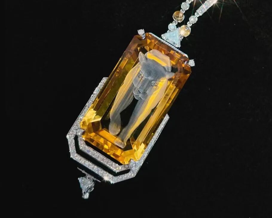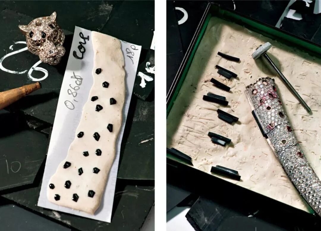 宝石雕刻师需要先悉心识别宝石中的内含物,分析宝石的微妙色泽,解析宝石透明度,甚至要观察光线如何透射,再去考究宝石最后应该以什么造型呈现。依据不同的复杂程度,一件宝石雕刻作品需要五个月到两年半的时间才可制作完成。我们前面提到的水果锦囊风格也大量运用了宝石雕刻工艺。其实从1900年开始卡地亚就开始向顾客呈现以雕刻硬宝石制作的装饰物品,包括动物或花卉造型的摆件、匣盒、书桌用品及座钟。2010年卡地亚开设了宝石雕刻工作坊,是唯一一家在品牌内部设有由艺术大师执掌宝石雕刻工作坊的珠宝品牌。PANTHERE ILLUSIONNISTE