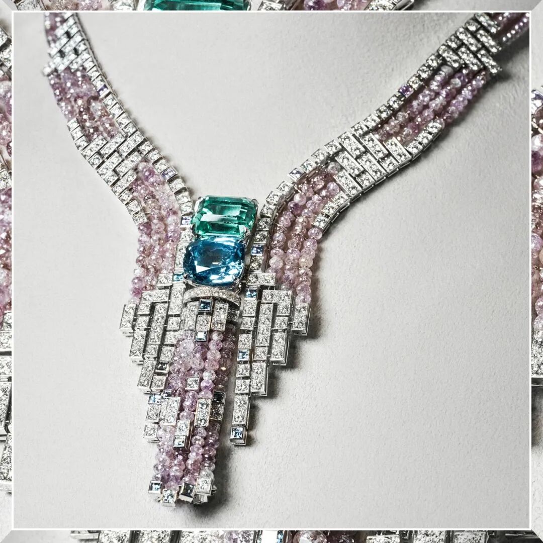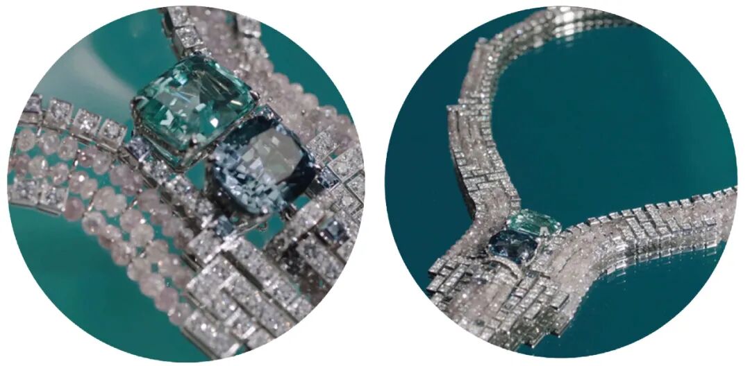一位熟练的宝石镶嵌师需要至少10至15年的工作经验才能打造出这样引人注目的珠宝作品。红绿配色和上条有异曲同工之妙,灵感来自于多肉植物,红色的枝叶在翠绿的藤蔓上蔓延,充满了勃勃的生机。我觉得整个的寓意就很巧妙。用宝石以抽象的形式打造出仙人掌的模样,仙人掌是生命力最顽强的植物,宝石也是恒久远的。感受完大自然的神奇,在这次卡地亚全新SIXIÈME SENS PAR CARTIER高级珠宝展现场还能感受到宇宙的奇幻与浩瀚。这条名为EVASION的项链中间的主宝石是一颗黑色欧泊。黑色欧泊是欧泊中的皇族,虽然是黑欧泊,但它其实并不是全黑色的。只是相比胚体色调较浅的欧泊来说,它的胚体色调比较深。黑色欧泊还有一个最大的特点就是会有彩变效应,宛如星河浩瀚一般,而周围层叠排列的宝石就像是围绕在周围的繁星。我觉得更妙的是粉色蓝宝石以流苏的形态呈现,就像是流星划过,多么浪漫的一条项链链。这枚由紫色玛瑙雕刻的莲花胸针是整个展览中最能激发我第六感的一件,感觉它代表了纯净、圣洁,是出淤泥而不染的清新与淡雅。卡地亚给它命名为“生命的蓬勃生发”,中间是一颗粉色梨形钻石,下面还点缀了一颗 1.14克拉彩棕色水滴型玫瑰式切割钻,宛若露珠划过花瓣。运用了Glyptics宝石雕刻工艺,让整个莲花栩栩如生,每一片花瓣和纹路都在努力绽放。这种雕刻工艺最早可追溯至远古时期,时至今日全世界掌握这门工艺的大师却是屈指可数。