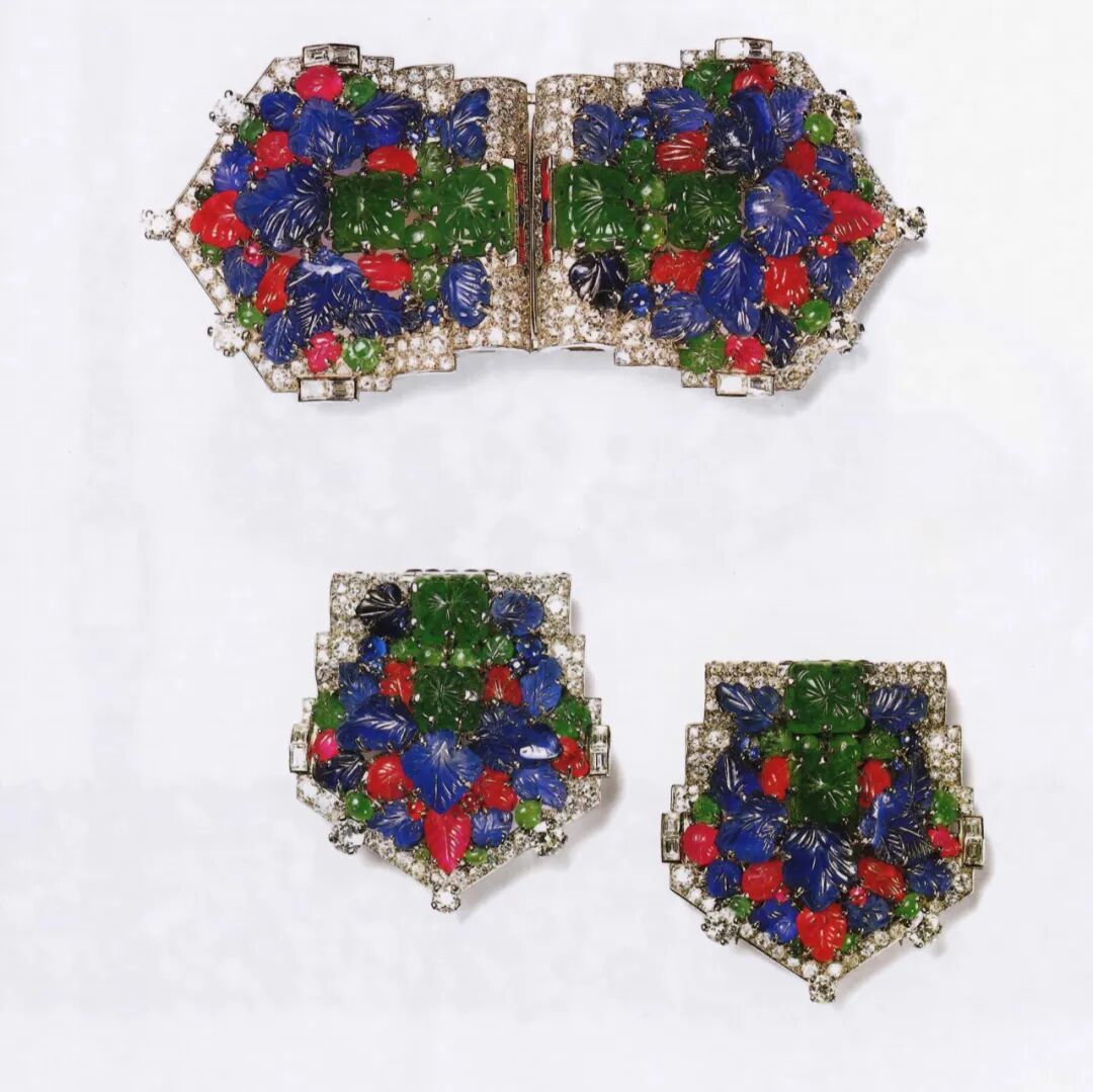 为什么水果锦囊能成为卡地亚最标志的风格?我觉得也跟卡地亚有着不随波逐流的精神有很大的关系。 故事要从19世纪说起,那时欧洲贵族们喜欢把红、蓝宝石和祖母绿分别与钻石搭配,但卡地亚却将不同色宝石混搭,打造出这种繁复又华贵的风格。水果锦囊的灵感来自于印度。当时卡地亚创始人的孙子Jacques Cartier(雅克·卡地亚)在欧洲与印度亲王建立了联系。他对这个神秘的国度感到好奇。1911年踏上前往印度的旅程,还经过了雅克经过德里、孟买、加尔各答等地。之后一直保持着往来,会定期访问印度。他从当地的宗教人物和传统图腾上获得无限灵感,学习了当地的宝石切割雕刻技术,还把当地的珍稀宝石和古董珠宝带回伦敦进行了一番研究。前面也提到,以往欧洲贵族追求精致优雅的珠宝风格。克什米尔蓝宝石、缅甸红宝石、雕花祖母绿,而当时的卡地亚偏偏却对这些充满异域风格情有独钟。▲1922年从印度建筑和首饰中汲取了灵感的一件铂金胸针,上面镶嵌了钻石、祖母绿和蓝宝石。让人联想起莫卧儿王朝宫殿华丽拱门。1937年乔治六世和1953年伊丽莎白二世的加冕典礼上,都出现过这件胸针的身影。光滑而带有罗纹的圆珠、椭圆形钻石、雕琢成花形的红宝石、蓝宝石、叶形雕花祖母绿相互簇拥,一派生机勃勃的景象,展现的是更自然的美感,水果锦囊的工艺也很复杂。雅克·卡地亚在探寻印度之后将很多莫卧儿王朝的宝石作品带回自己的工坊,学习其中的雕刻手法,并成为自己的传承技艺。▲其实不同种类的宝石拥有不同的特性,红宝石和蓝宝石质地均匀,而祖母绿则较脆硬,根据不同宝石纷繁复杂的硬度、内含物、期望呈现的形状等,宝石雕刻师来决定采用相应的雕刻手法,雕琢出逼真的花果叶形。被老佛爷Karl Lagerfeld称为“所见过最时髦的女人”的Daisy Fellowes(黛西·法罗丝)就曾在1936年将自己珍藏的3件珠宝交给卡地亚,将它们重新设计,打造出了这条“Hindu”项链。