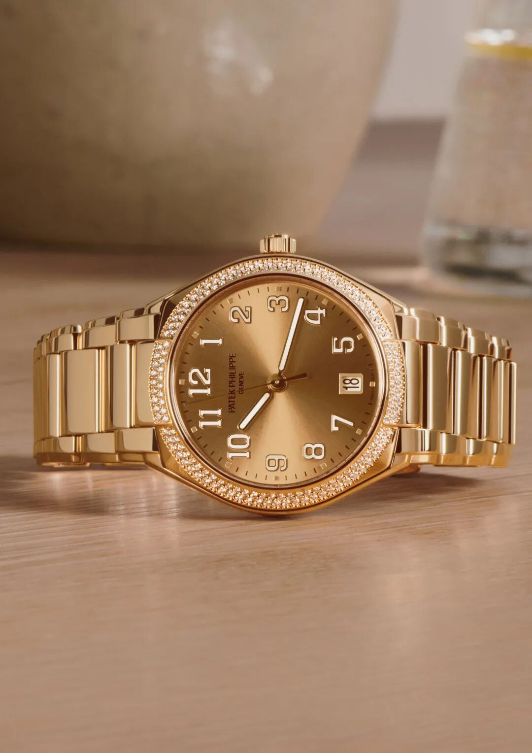 表圈周围镶嵌了两排钻石,总共有160颗,整个就是“金光闪闪”,但这种光泽是沉润柔和的,因为其中用到了百达翡丽专属的“Dentelle“(蕾丝)镶嵌工艺,两圈钻石是交错点缀的,细看能感觉到它的排布真的就有蕾丝一样的美感,也让这块表的光泽变得更加细腻夺目。