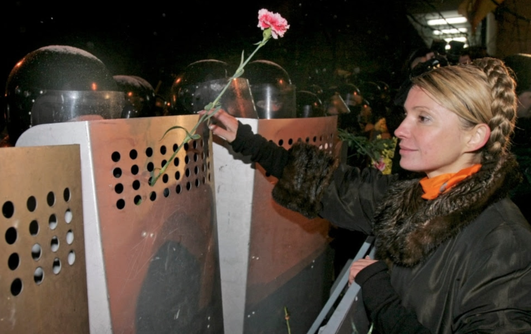 ▲2004年11月,尤利娅季莫申科与在基辅守卫总统办公大楼的防暴警察交谈。