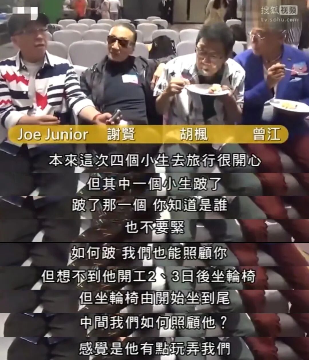 最有名的例子就是他和谢贤在后台的掌掴事件。四个老头拍摄TVB的一档旅游综艺节目,没想到曾江腿不好,要坐轮椅,常常让别人推他,大概态度很倨傲吧,把谢贤惹急了: