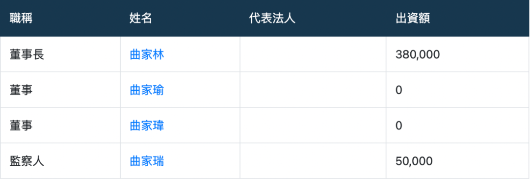 ▲ 根据家族公司的注册地址可以找到四姐弟的姓名,按长幼排序,分别是:长姐曲家瑜、老二曲家瑞、弟弟曲家林、小妹曲家玮。