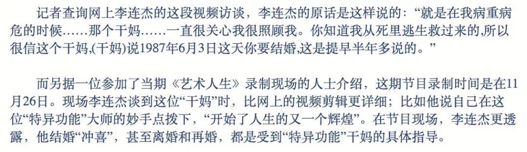 ▲ 两人在《少林小子》、《南北少林》里都有合作,是当时公认的金童玉女。1985年在拍摄《南北少林》期间,李连杰把腿摔断了,伤势严重到可能会带来终身残废。黄秋燕就一直在旁贴心照顾,直到他最终康复。他们的感情可以说是水到渠成,顺水推舟。李连杰很久之后形容说,前妻对自己的爱有百分之八九十,而自己对她的爱只有百分之二十。这么不平衡的爱注定是场悲剧。1987年6月,李连杰迎娶了黄秋燕,只有简单低调的领证,并没有宴请或者其他仪式。后来李连杰在05年一期《艺术人生》的采访里说,他是因为会通灵的干妈告诉他要结婚“冲喜”才决定结婚的。▲ 事实上这位叫赵群学的干妈(图右),是位目不识丁的贵州山村妇女,据说曾经帮李连杰看病解决了他的长期困扰,所以此后李连杰对她言听计从,甚至包括后来拍摄徐克的《黄飞鸿》也是来自这位干妈的抓阄。1988年,怀着7个月身孕的黄秋燕跟随李连杰去洛杉矶发展,两人贷款买了栋房子,同年生下大女儿李思。