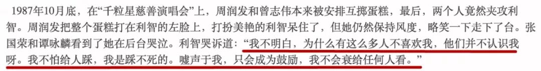 早年因为“外来妹”的身份利智受过很多委屈,除了嘲笑她的粤语发音不标准,有观众在亚姐颁奖礼时向她发出嘘声外,还受到过演艺圈同僚的排挤。
