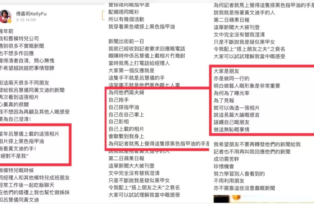 但是呢,事情还没有完结。多年后,就在黄文迪被拍到出轨照片、吕慧仪发表离婚声明的时候,傅嘉莉也发声了: