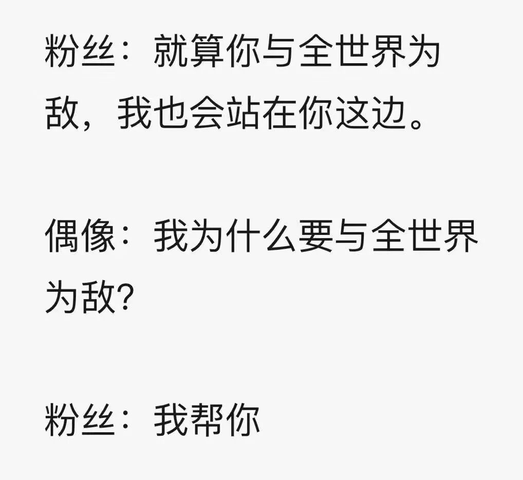 怎么说呢?有界限的爱粉丝是隔壁村的王小妹,仰望、暗恋,但他还是他,你还是你,而没有界限的爱是硬要变成偶像的亲妈,给他吃给他穿给他钱,但是他找什么妹子接什么戏成为什么样的人全得听妈的,久而久之,偶像慢慢就变成了粉丝的傀儡与牵线木偶,那后面其实就是深藏于幽暗人性之中可怕的控制欲。