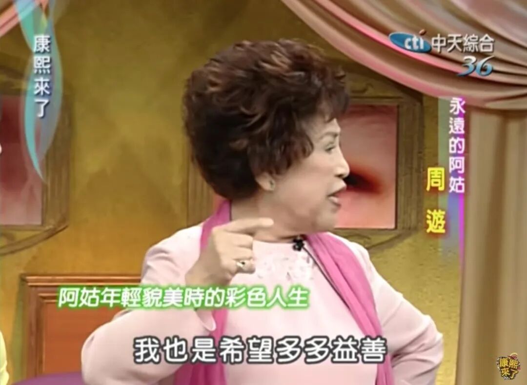 所以,周游的敢想敢做、敢爱敢恨,毫不在乎周围人的眼光,硬是把自己变成了世俗评价系统之外的女人,指指点点这种事她已经从来不在乎,在某种程度上说,她是“领先于时代”的女人。仍记得周游七十多岁穿着露背装上《康熙来了》,不等小S说话,就自己走起了风骚台步,还大方地说自己“该大的地方大,该小的地方小”,以及“希望追我的人多多益善”。