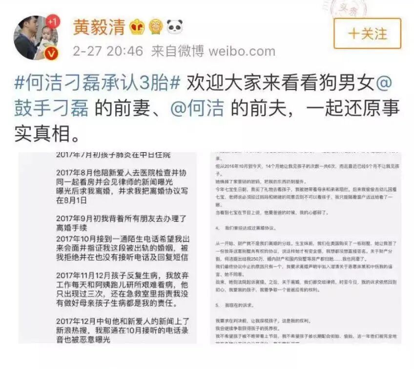 小黄是某种典型的富二代性格,嚣张又浮夸,口无遮拦,经常在网上掐架,没人能让他闭嘴。多年来小黄公开数臭前妻,咬着不放也就算了,他还喜欢插手别人家事。跟他完全没有的关系的何洁疑似婚内出轨新闻出来,他会在微博直接骂何洁刁磊“狗男女”、“不得好死”,纯吃瓜吃到这样激情四射也是没谁了。小黄张口就说有人吸食冰毒,他手上有对方吸毒的视频,并打包票对自己的言论负法律责任,言之凿凿。反正小黄说的小薛吸毒的视频我们到现在都没看到,他本人倒是因为吸毒进去了。说是对自己的言论负法律责任,但小黄在微博上张嘴瞎说被告败诉的例子还少吗。他口中的十恶不赦的前妻最终赢了名誉权官司,脸被打得啪啪响。