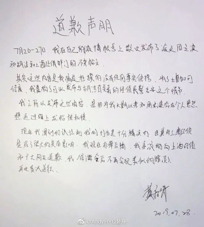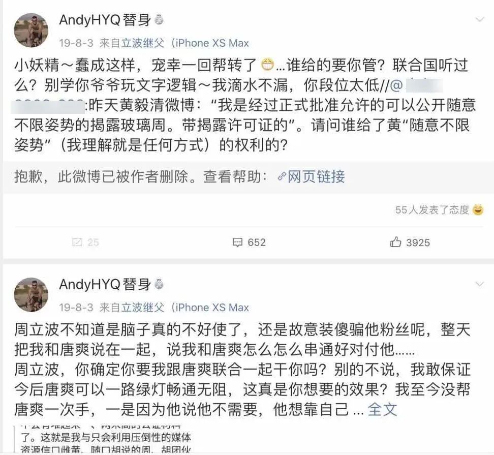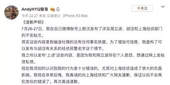 说有老周的大料,结果转眼就输了官司,不得不在微博向老周道歉。那这些败诉让小黄闭嘴了吗,没有,2019年7月28日刚全网道完歉,他转头就又能毫无顾忌地在网上对老周破口大骂。什么叫狂人,这就叫狂人,不管后果,见人就死咬不放。
