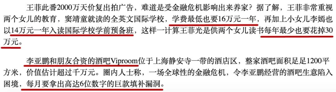 ▲ 当时的爆料称“节目目测投资3亿以上,其中1.5亿用来邀请某天后”。当然另有说法是超一线待遇的顶级价格,大几千万肯定是少不了的,毕竟王菲的身价摆着呢。▲ 她在节目现场面对何炅提问“为啥要来”时,依旧那么直白地回答,“因为轻松”。这个万众期待请来一大票明星的节目由于后期制作太无聊,很多技术亮点无法呈现在电视屏幕上,头两期新鲜劲过去就后继乏力了,真的是王菲坐镇都拯救不了每期下滑的收视率。废话,谁不缺钱啊,天后并非不食人间烟火啊,她也需要赚钱支付生活开支,包括孩子的学费等等。▲ 就算已然成年的窦靖童手握叫人艳羡的资源不用母亲操心。她当时代言SK-II引起了许多人的眼热,被指责是娱乐圈的裙带关系。▲ 而小女儿李嫣正处于花钱的时候,她就读的瑞士贵族学校(College Alpin Beau Soleil)每年学费就要82万。▲ 王菲被拍到带着李嫣和小苹果(汪峰的女儿)还有她们的白富美闺蜜周巴黎一起逛街,大方买单,被指说两个小时花费10万。(这里可回顾)虽然事后李嫣否认了此新闻,但富二代的的消费水平就摆在那里,都有价格,他们日常生活就是比我们昂贵很多,这一点其实毋庸置疑。孩子的教育投资,维持自身高价生活水平(请保姆、做保养、自我身体的修护等等)需要的金钱成本,为退休养老做谋划的提前准备,这些都是钱啊。所以我们不难发现,以05年为分水岭,天后之前十年接的广告生动有趣创意无限,09年复出后却多了份接地气的实在感,像金典有机奶这样长情的十年合约更是省心又自在。不再需要为广告量身定制歌曲,也不用走俏皮乖张的奇怪路线,露个脸念句旁白就能轻松把钱挣了,又何乐而不为呢,稳妥,省心,轻松,这是拍广告的好处。当然也有人问,为啥只有王菲在广告圈有这样的影响力?好像站在那里就能有人买单,同时代的天王天后哪有她这种影响力?![]()