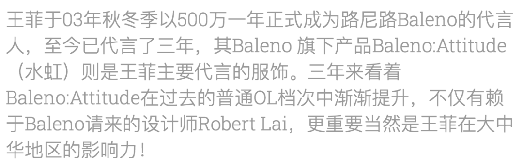 如果说上面两个快销品的广告还在意料之中,王菲接下以下这个品牌可是可比现在接内外更让人觉得更有趣。时间来到2003年,班尼路花费500万一年的酬劳邀请王菲成为代言人,最早班尼路号称是香港品牌,1996年它卖给了广州德永佳集团,其实只能算是个内地品牌。但它舍得花钱请最火的明星代言,高峰时期它在内地有过四千家门店,郭敬明把它封为早期每一个小镇青年的梦想。分别请来了刘德华和王菲做代言人。华仔还曾在他06年投资的电影《疯狂的石头》中免费给班尼路做了次广告。▲ 一句“牌子,班尼路”惹得大家哈哈大笑,可惜后续带来的似乎是反效果。其实王菲当时代言的是Baleno Attitude“水虹”,一个纯卖女性服装的高端品牌。
