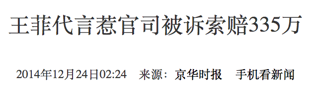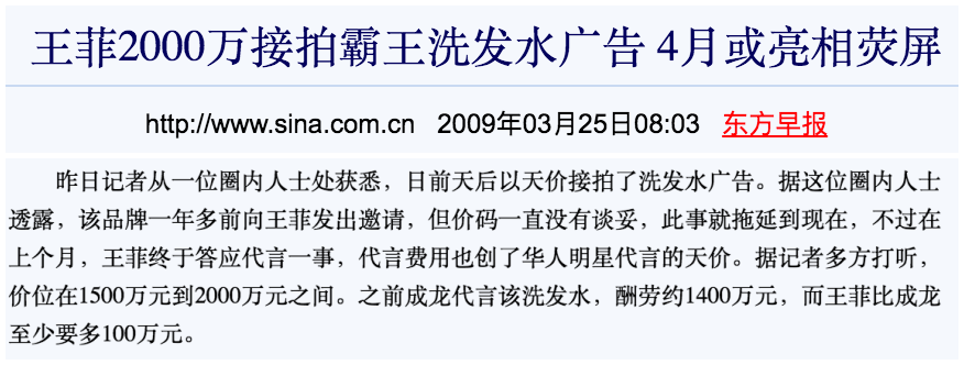 ▲ 年初时隔12年重回春晚舞台,演唱了《传奇》。可以说这段时间是天后的低落期,无论是接的广告还是演唱会都不尽如人意,要生活要挣钱的意味很深沉,但不得不说王菲对品牌的加持作用还是很明显,追风和本草堂这两个横空出世的系列一下子蜚声全国。先是2010年,香港某周刊诽谤霸王洗发水中含有致癌物质,王菲代言的追风中草药洗发水也在检测之列未能幸免,一时间明星公信力被质疑。▲ 霸王用了整整六年时间控告周刊诽谤,最后取得胜诉,却仅获赔300万,但这些年因为名誉受损导致的亏损累计高达17亿。接着14年年底,传出当时帮忙牵线联系霸王代言的居间人向王菲追讨居间费。▲ 09年,王菲代言追风和本草堂时,收取的代言费是2400万;11年代言到期后,王菲继续单独为本草堂代言,此次收取的费用是3000万。但由于和商家客户达成朋友关系而不愿意向一开始促成合作的向先生支付后续的居间费。▲ 四年后,此案落下帷幕,原本索赔335万的居间人只获赔了60万。十年前代言Jovell向商家追讨代言费,十年后又被居间人追讨居间费,天后虽然谨慎,但有时候也不是百分百保险,难免有纠纷,所谓人在江湖,哪能不湿鞋。▲ 消息传出时,经纪人还出面否认,其实是因为传言中代言的是蒙牛,实际上却是伊利旗下的金典。