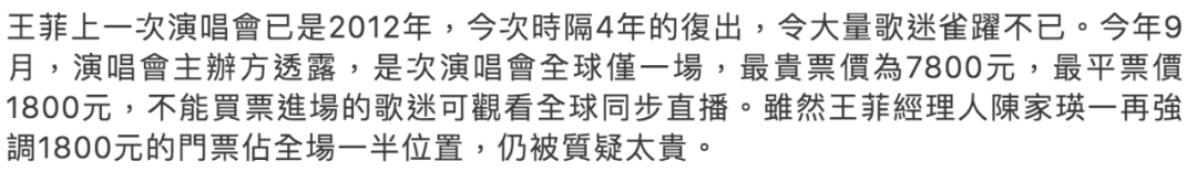 ▲ 最近一次亮相是5月4日和常石磊在相信未来抗疫直播中合唱《人间》。天后永远都自带光芒,她的一言一行一举一动都能成为媒体争相追逐的焦点,私生活更是被人广泛关注。▲ 2014年,被拍到和谢霆锋上演世纪大复合,激吻纱窗后。▲ 两人无名指佩戴的戒指也常被揣测是否是好事将近。▲ 我想按王菲早年的性格一定在内心千百次OS,关你什么事。对自我隐私的保护和神秘加深了大众对她的渴望和想象,以至于每次公开登台亮相都能引起喧哗,纷纷猜测到底是用多大筹码才能请她出场。她也曾有过那么几次被人质疑是捞金,比如舆论反弹最大的一次便是2016年底的幻乐一场演唱会,因为票价过高引发争议。▲ 这场时隔2012年巡回演唱会四年的回归之作,最便宜的票价高达1800,最贵票价为7800,因而引发“反炒”风波,被指责是饥饿营销、坑钱。娱乐圈纪检委王思聪在当时他的节目《小葱秀》里谈到此事,表示本次演唱会获利最多的无非就是王菲和经纪人陈家瑛。尽管事后主办方澄清说因为全球直播等技术要求才导致制作成本无法下调,大众显然并不买账。18年,她参与了综艺首秀,湖南卫视的《幻乐之城》,被谣传拿了上亿酬劳。