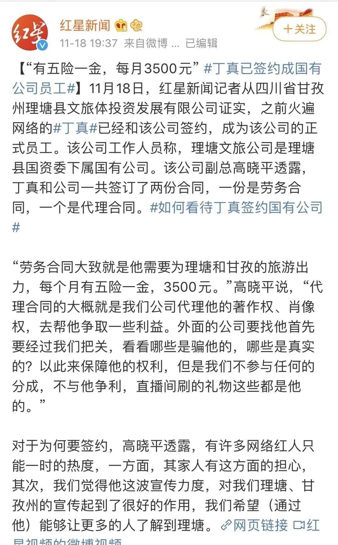 #这就是媒体公信力##在大部分人热衷于网来网去的时候,真正的记者会去探究真相#丁真澄清了背后有推手,他说,不知道自己火了,不想当明星,只想当赛马王子▼▼▼更让人心疼的是,还有消息说,丁真从小因为要帮家里放牛,没机会读书,所以连普通话都说不好#其实人家有读书,藏文还写得很好看#▼▼▼但又有人站出来反驳:牛很值钱的好不好,丁真家可是大户人家▼▼▼11月18日,丁真爆火的第7天,就在大家担心他要被娱乐化资本化消费的时候,丁真与理塘县国资委下属的——理塘县文旅体投资发展有限公司签约了,成为当地旅游大使▼▼▼劳务合同有五险一金,月薪3500元,不需要像正式员工那样上下班,可以一直执行到他退休;