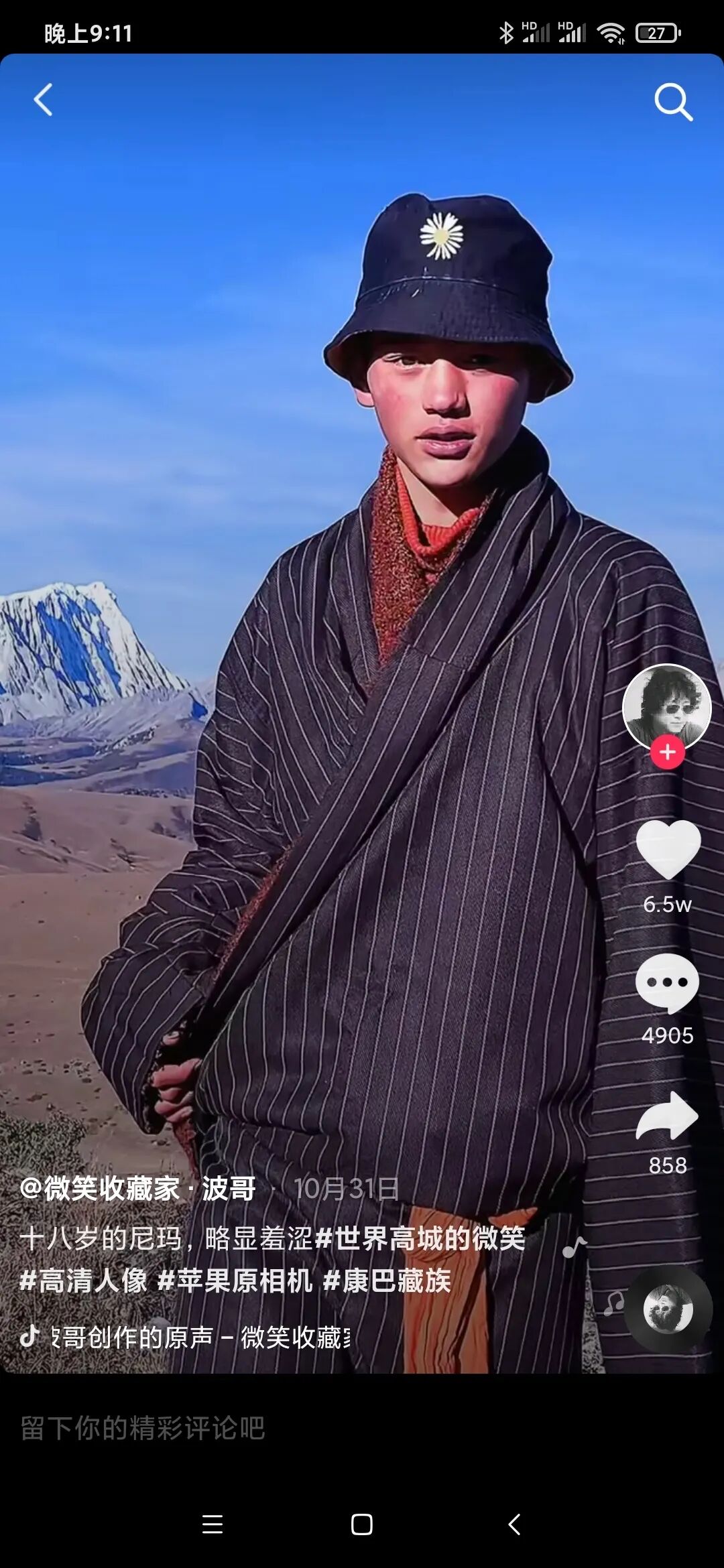 2020年双十一刚过一天,网上正沸反盈天的买买买之际,抖音上一位叫“微笑收藏家·波哥”发布了条七秒钟的视频,配文写道:“很多年轻女粉要我多拍拍尼玛。尼玛没遇上,见到他的哥哥丁真。”