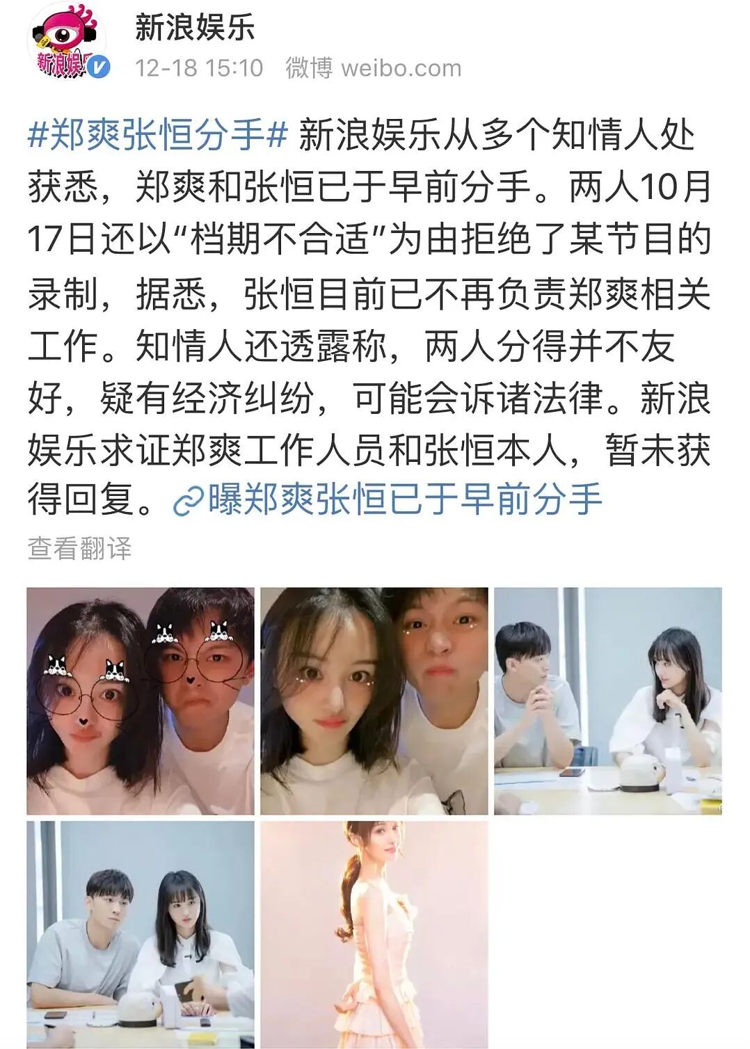 ▲ 虽然张恒表示是自己的安排,分担了被各方痛骂“炒作”的火力。▲ 但在《女儿们的恋爱》节目摄像机的记录下,主动提出此事的似乎是郑爽本人啊。说到《女儿们的恋爱》节目,真的是全程见证了他两的情感破裂,很少能有一对情侣/夫妻能在节目里把“不合适”这三个大字展现得如此淋漓尽致:▲ 他两最平常出现的沟通状态就是鸡同鸭讲,彼此不在对方的频道。到最后,郑爽开始啜泣,张恒依旧是一副无动于衷的表情:隔天,“张恒冷暴力”登上热搜榜,导致骂声一片,郑爽的父亲还专门出面回应:如果单看截图,我想大家一定会觉得这男的太不行了吧,为什么甩脸啊?但他的不爽也不是空穴来风的:▲ 郑爽因为“追求完美”,再过了一个月后又把方案推翻重来,导致团队成员的前期努力付诸东流。也许双方各有考量,但因为完全不会沟通,导致隔阂愈发明显。▲ 但郑爽完全缺席了节目的最后部分,压根没有交代,而郑爽更直说要把重心放在工作上。看这两张图显然不同的鼻子,也知道中间肯定间隔了一些时间。关于两人分手的传闻不断,直到2019年12月才有了最终的确认:分手之后,双方合股的公司随即停运。而2020年1月8日,郑爽更是直接来到法院起诉张恒,疑似民间借贷纠纷:▲ 要知道那时他们的第二个孩子才在美国刚刚出生啊。两人的后续新闻无一不跟钱挂钩,关于郑爽被骗得“一塌糊涂”的流言甚行,甚至越传越离谱,有说张恒以郑爽名义借高利贷,也有说张恒騙走郑爽几千万。反正,在粉丝和大众心里,这个男人骗财骗色十恶不赦。对于这些有关前任的流言,郑爽又一次发挥了她让前任无一善终的本领,不单不曾出面回应,更是在吐槽大会上暗戳戳地表示前经纪人只是个跑腿的,却卷走了钱:▲ 这里不得不佩服,要知道她一个人的热度和战斗力足以和好几个顶流还有工作室抗衡。眼瞅着鼻子修复、颜值回春,在离开大众心里的“渣男”后,郑爽似乎一切都在往更好的方向发展了。整个2020年,她接了好几个综艺,霸屏热搜:而最让人觉得讽刺的是,像《奇妙的森林》这样带孩子的节目,她口口声声说着要对孩子耐心,却似乎忘了自己生物学上的孩子还在大洋彼岸等着回国呢。而在《让生活好看》里,她也主动提到了“冻卵”和别的技术:▲ 2020年5月,主动在节目里提到说自己搞不定上海男人。前男友里张翰是黑龙江人,张恒是武汉人,只有胡彦斌是上海人。事后,胡彦斌连发四条微博,做好被粉丝、大众狂骂的准备也要表态不想再有任何牵扯:▲ 就算伤敌八百,自损一千,也要和你老死不相往来!