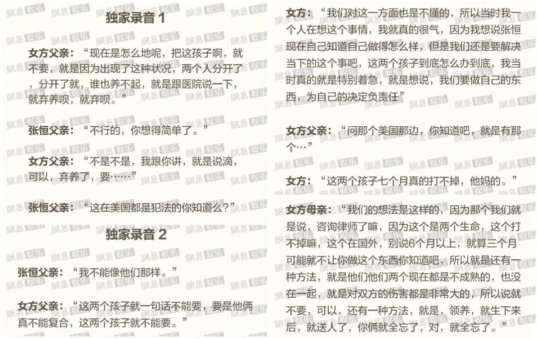 问题是在而今疫情如此严重的情况下,郑爽真的会为了官司飞回美国去么?这显然是个大大的问号。还有网友揣测,张恒之所以选择此时今时今日爆料,很可能是因为这是两人的结婚纪念日:▲ 上面赫然列着郑爽和张恒作为父母的名字,连生日都对应无误(可以放大图片看,图源:网易娱乐)。发现槽点没?一共两个孩子,一个出生在科罗拉多州,一个在内华达州,连孩子的生日都不同,一个是19年12月19日,一个是20年1月4日,显然是分别代孕产下的。▲ 注意看右下角还在医院的图,正是孩子刚出生时所拍,至少说明孩子出生时男方是全程陪在身边的(图源:网易娱乐)。然后张恒的所谓朋友还接受了采访,表示因为郑爽不配合法律程序,导致小朋友没办法合法回国,张恒自己也回不来,所以心理压力非常大:这里牵扯到在美生子的问题,我们专门咨询了专业人士一下,为什么一方不配合法律程序会导致小朋友无法合法回国。因为作为在美国出生的孩子,手拿美国护照,回国势必就要办理旅行证,而在中国驻美国总领事馆的官网上清晰写着需要办理旅行证的材料,截取了其中重要的一段:▲ 如果父母双方不能同时在场,也需要提供另一方的护照原件以及复印件,但显然郑爽一方不愿意提供这样的材料帮助孩子办理证件回国,导致进程搁浅,变成无解。至于阻碍孩子回国,到底是不是担心曝光后影响事业,就无人知晓了。网易娱乐独家爆料了郑爽以及父母还有张恒父亲的电话录音,文字版整理如下,截出了其中的几个重点:▲ 录音里疑似郑爽的父亲直截了当地提出了“弃养”,母亲也说“因为不能复合,孩子就不能要”,而疑似郑爽直接飙了句脏话“七个月真的打不掉,他妈的”,最后郑爽父母的意思是生下来找领养。可以去听听录音原版,言辞冷漠超乎想象令人发指,仿佛他们在谈论的从来都只是一件商品,而不是两个活生生的生命(图源:网易娱乐)。至此,事情已经不只是感情破裂、离婚分产了,还牵扯到了代孕生子、弃养等一系列伦理问题。此番爆料注定了他两不管前程往事孰是孰非,终究是往鱼死网破方向发展了。郑爽和张恒相识在《这!就是铁甲》节目中,就是那个她在台上歇斯底里,吴尊连连摆手节节后退的节目:而她发飙时,站在台下一脸懵逼的白衣男子便是当时的赛事总监张恒:就算吃瓜群众们觉得郑爽的情绪也太不稳定了吧,这两人竟然出人意料地相爱了。不管过往的感情收场有多狼狈,郑爽至少是高高在上的女明星,所以当传出她和节目赛事总监好上的消息,大家多少还是有点讶异。但这位张恒虽然比不上日进斗金的明星,自身条件还算凑合,海归、1.85米的身高、长得也还行:
