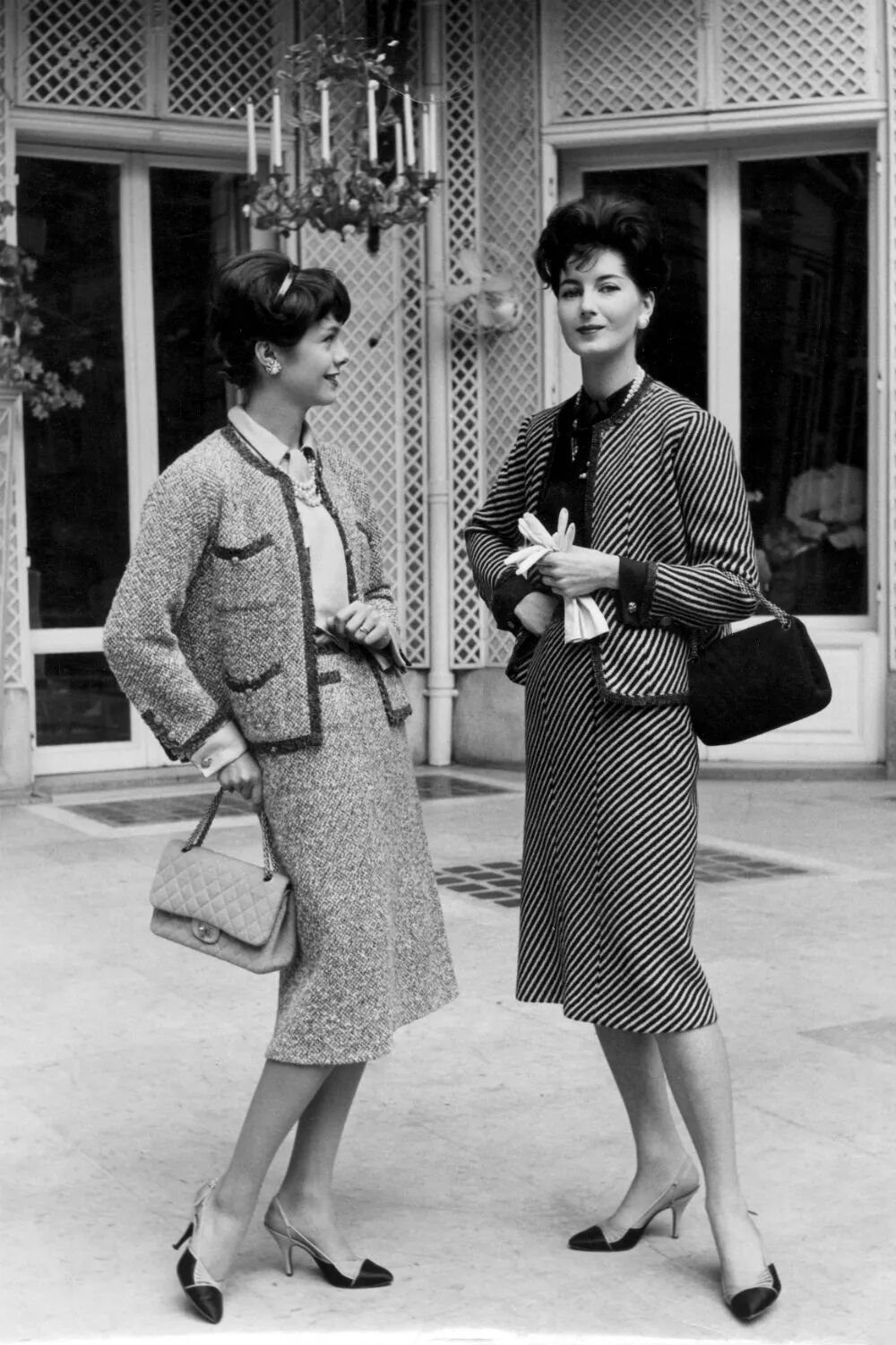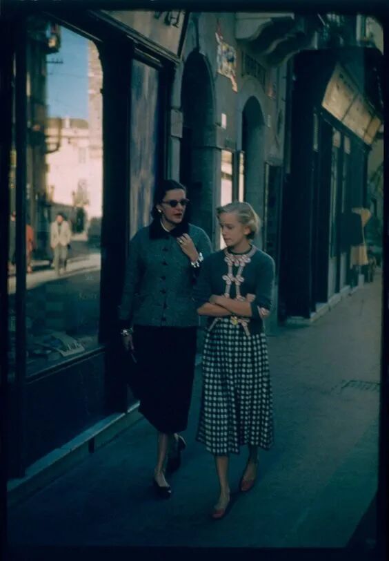 她开心地和他一起笑着闹着,对海沃德和前妻的女儿也视如己出:▲ 1957年,Slim和海沃德的二女儿Bridget一同出现在瑞士街头。她这一身粗花呢上衣正符合当时香奈儿回归的时尚风潮。就在迪奥大获全胜之际,时隔15年重新回归时尚界的香奈儿首战告败,一度被认定一败涂地。但伴随着香奈儿经典外套的出现,斜纹软呢的用料、考究的剪裁,不再是紧身收腰,而是柔软贴身,给予女性绝对的行动自由: